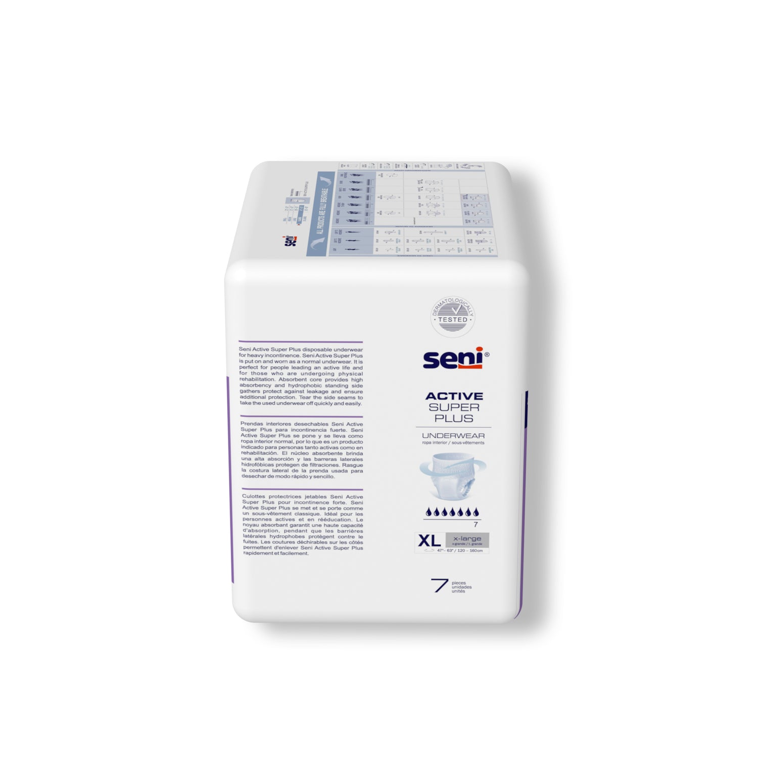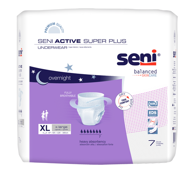 Seni active super plus x-large disposable underwear is a perfect solution for people leading an active life or participating in physical rehabilitation.They are ideal for heavy incontinence and overnight protection.Worn like normal underwear for discretion and exceptional comfort.; perfect for active people and during bladder training.; fully breathable outer layer allows humidity to evaporate to promote a skin-friendly microclimate.; absorbent core provides high absorbency and the feeling of dryness.; superabsorbent locks in moisture to prevent skin irritation.Locking urine inside the core also reduces bacterial growth and helps contain odor.; hydrophobic standing side gathers for better protection.; elastic leg cuffs ensure perfect fit.; extra dry system (eds) non-woven layer for quick and effective absorption.; soft, delicate materials and perfect finish for maximum comfort.; discreet and hygienic disposal thanks to special tape on the back of each product.; not made with natural rubber latex.; tear-away side seams make removal simple and easy.Waist/hip size x-large 47"-63"