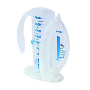 Airlife volumetric incentive spirometer with one-way valve, 4000 ml capacity, dual sided calibrations, flexible tubing, mouthpiece holder.
