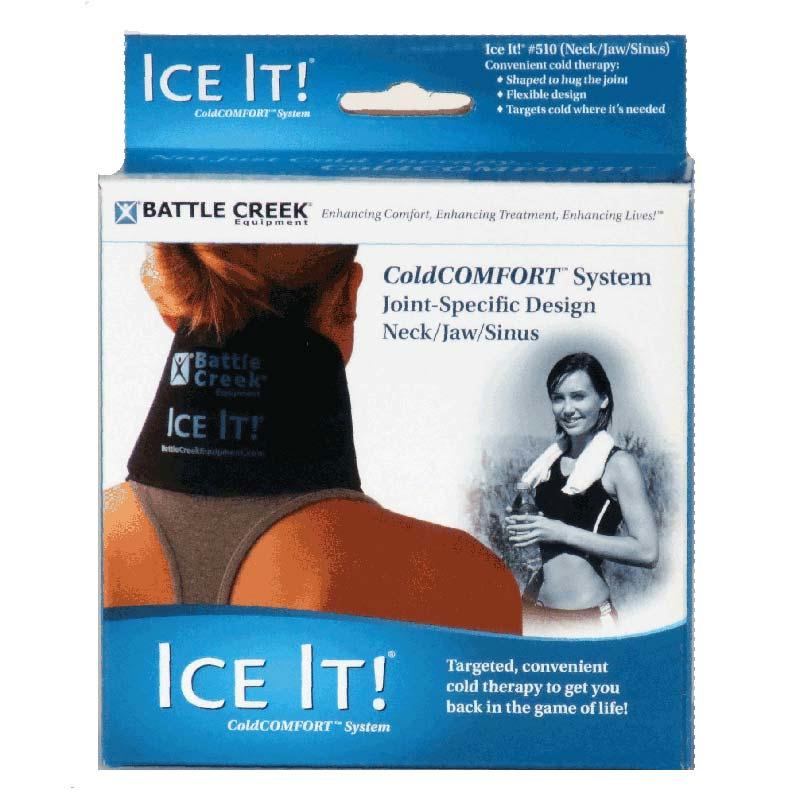Ice it deluxe 4-1/2" x 10" cold therapy system for neck/jaw/sinus.The complete cold therapy system includes the 4" x 9" cold pack, fabric cover and elastic strap with velcro.