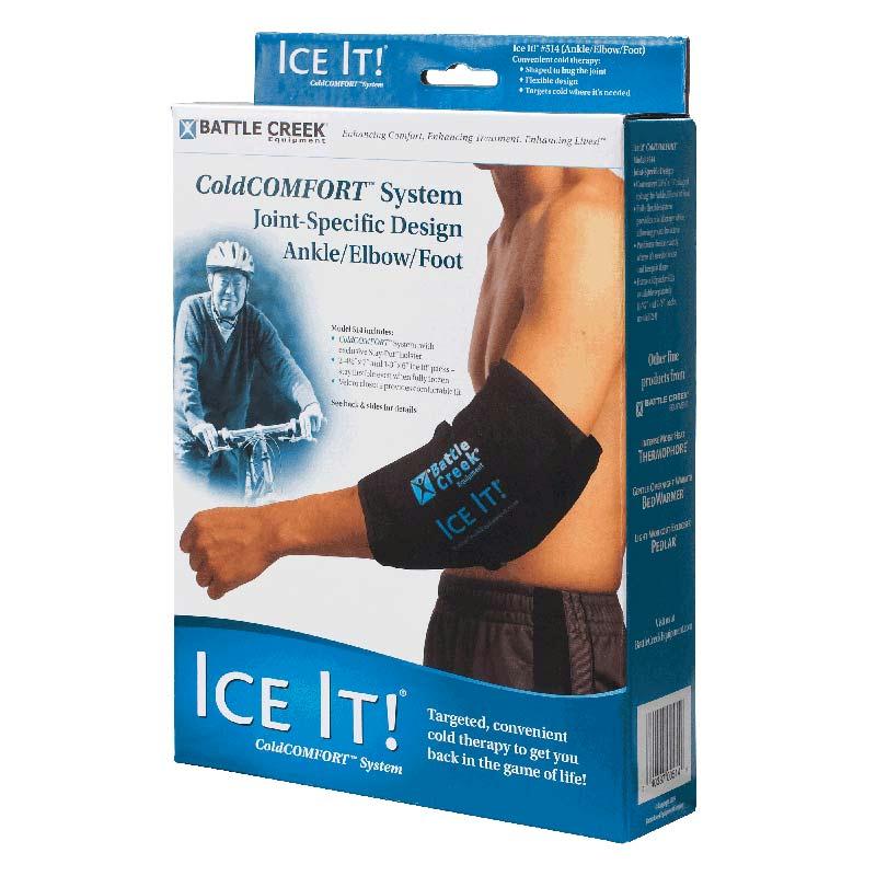 The ice it coldcomfort ankle/elbow/foot system, 10.5" x 13".This complete cold therapy system includes two f-pack cold packs, a g-pack cold pack, and a fabric cover with both velcro and elastic straps.