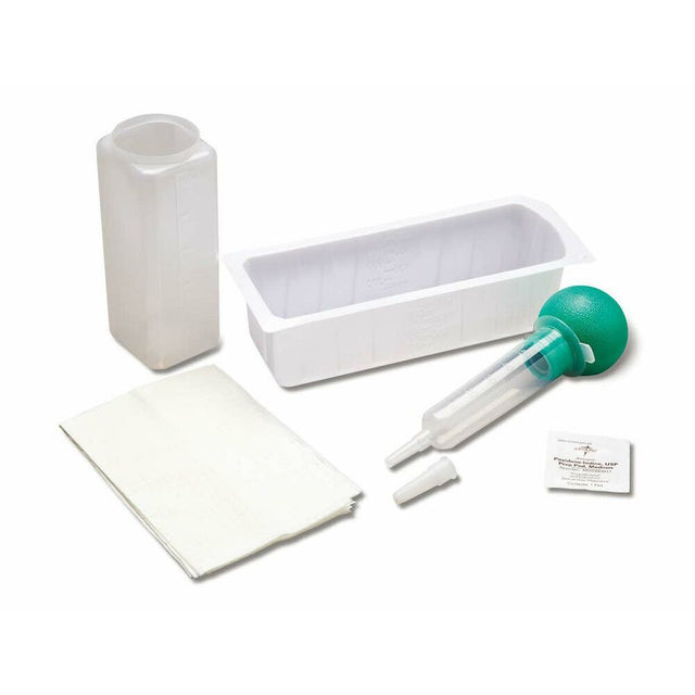 Sterile bulb irrigation tray, latex-free.Includes: 1000cc outer tray, 500cc graduated container, 60cc bulb irrigation syringe, alcohol prep pad, large moisture-proof underpad.