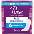 Poise moderate long pads 12.4".Poise moderate absorbency incontinence pads are specifically designed for women with light bladder leakage and stay 3x drier than leading period-only pads.The leak-block sides give you outstanding incontinence protection while an absorb-loc core quickly locks away wetness and odor.