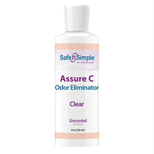 Assure c odor eliminator 4 oz.Bottle, unscented.Is a clear formulation that eliminates the fear or concern of staining associated with the blue color deodorant formulations.Delivers outstanding odor control with no perfumes or artificial scents added and contains a lubricant to help empty pouch contents.Convenient tilt tip dispenser bottle