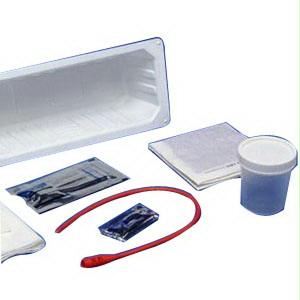 Dover open urethral trays, add-a-cath, pvp swab sticks, 1200 ml graduated basin, exam gloves, lubricating jelly, specimen container and underpad/drape.
