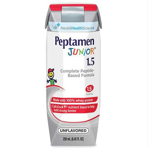 Peptamen junior 1.5 complete peptide-based elemental unflavored liquid nutrition 250ml, 375 calories, lactose-free, gluten-free.