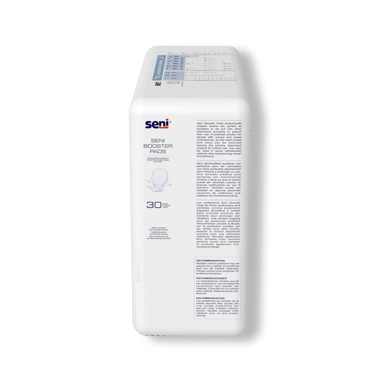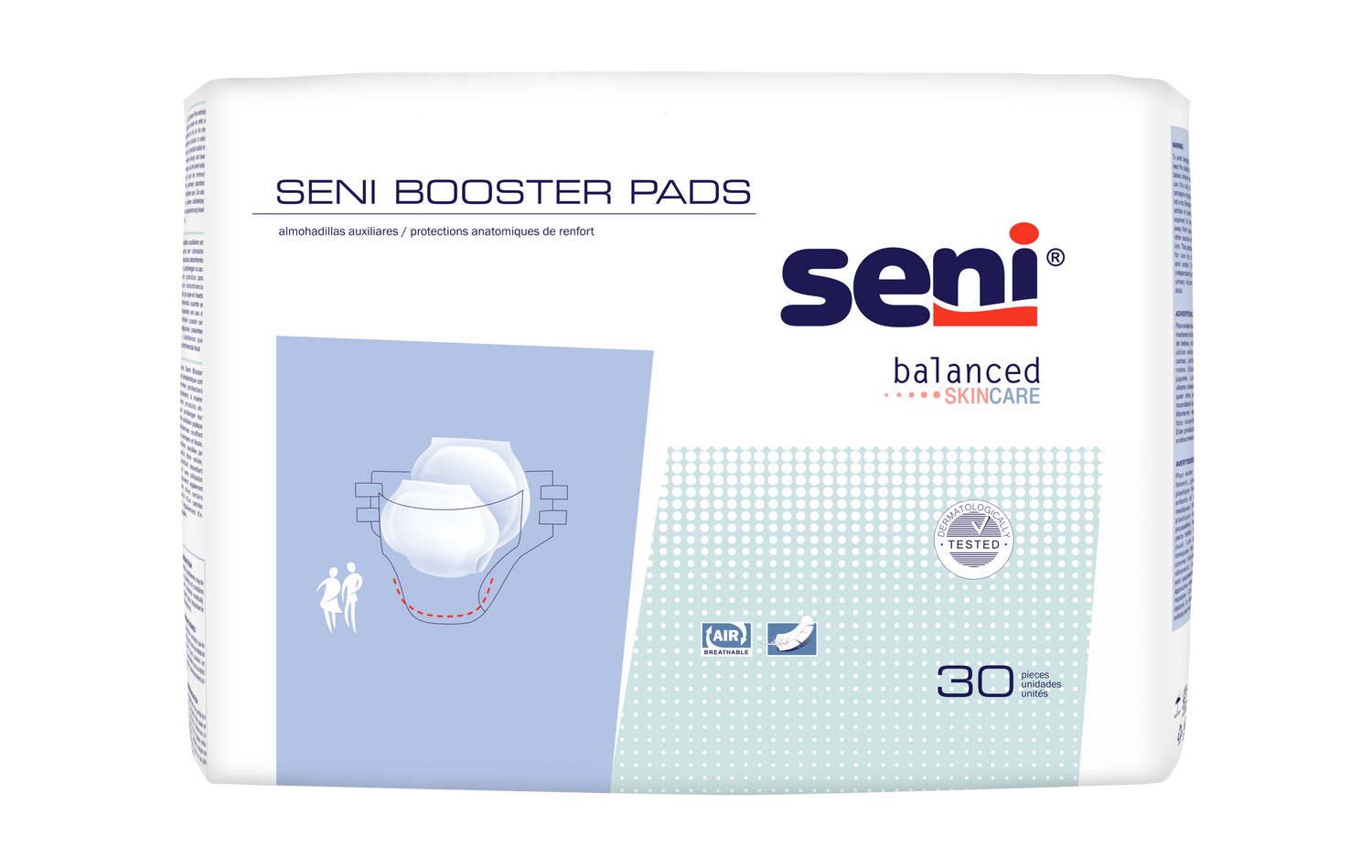 Seni booster pads anatomically shaped inserts are perfect as boosters to be put into other absorbent products to extend their use.A practical solution for people with urinary and bowel incontinence, as the insert soiled with stool can be removed leaving the primary absorbent product for further use.Without the insulating backsheet.; can also be used in some catherized patients also experiencing bowel incontinence.Note: do not use as an independent product in case of loose stool or in urinary incontinence.Pad length 25"