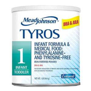 Tyros 1 non-gmo category 1 metabolic powder, 2270 calories per 1 pound (454 g) can, 16.7 grams protein equivalent per 100 grams of powder, vanilla scent.Tyros 1 is an iron-fortified infant formula and medical food powder that is free of the essential amino acids phenylalanine and tyrosine for infants and toddlers with documented tyrosinemia.This product provides all other essential amino acids as well as nonessential amino acids, carbohydrate, fat, essential fatty acids, vitamins and minerals.Use under direct and continuing supervision of a doctor.