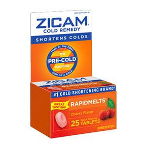 Zicam cold remedy rapidmelts, cherry flavor quick-dissolve tablets, 25 count.This homeopathic cold remedy is made with two unique formulations of zinc, an essential mineral which has been shown to shorten the length of colds.Non-drowsy, non-habit forming.Active ingredients: zincum aceticum 2x and zincum gluconicum 1x.